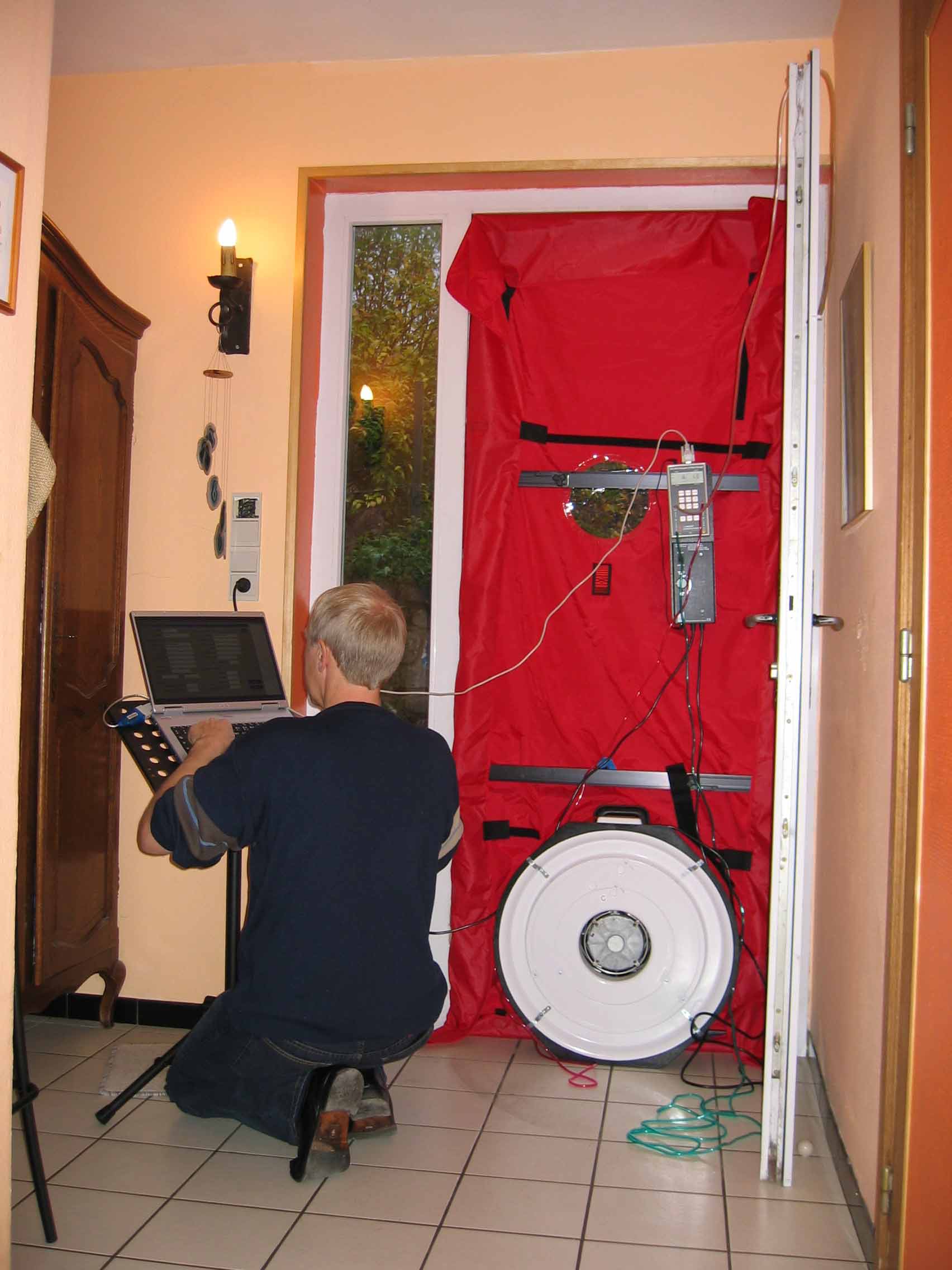 - Un cadre adaptable muni d'un ventilateur est placé dans l'ouverture d'une porte extérieure et le bâtiment est mis en dépression et en surpression. Des jauges branchées sur le ventilateur mesurent le débit d'air requis pour garder la maison à une pression constante, ce qui permet de mesurer le taux moyen de renouvellement d'air dans l'habitation.